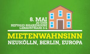 Am 8. Mai (20:00 bis 21:30 Uhr) möchten wir mit Euch und unseren Gästen im Sharehouse Refugio (Lenaustraße 3-4) darüber ins Gespräch kommen, welchen Einfluss europäische Politik und Wirtschaft auf die Mietenkrise hat und welche europäischen Lösungen uns dabei helfen könnten, die Mietenkrise in den Griff zu bekommen.