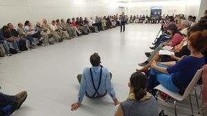 Unter dem Motto "Bezahlbare Mieten. Gegen Verdrängung. Wir bleiben alle!" hatte der Quartiersrat Reuterplatz am Abend des 12. August 2013 zur Auftaktveranstaltung des "Bündnis Bezahlbare Mieten Neukölln" geladen. Mehrfach müssen neue Stühle organisiert werden, damit alle im großen Kreis Platz finden. Ganz bewusst wollten die Organisator_innen keine klassische Podiumsdiskussion mit wahlkämpfenden Politiker_innen, sondern eine Veranstaltung, bei der die Anwohner_innen selbst ausführlich zu Wort kommen sollten. Auch die Kommunalpolitiker_innen quer durch alle Parteien wurden eingeladen – aber nicht, um ihre bekannten Statements vorzutragen, sondern um den Sorgen der Menschen zuzuhören.