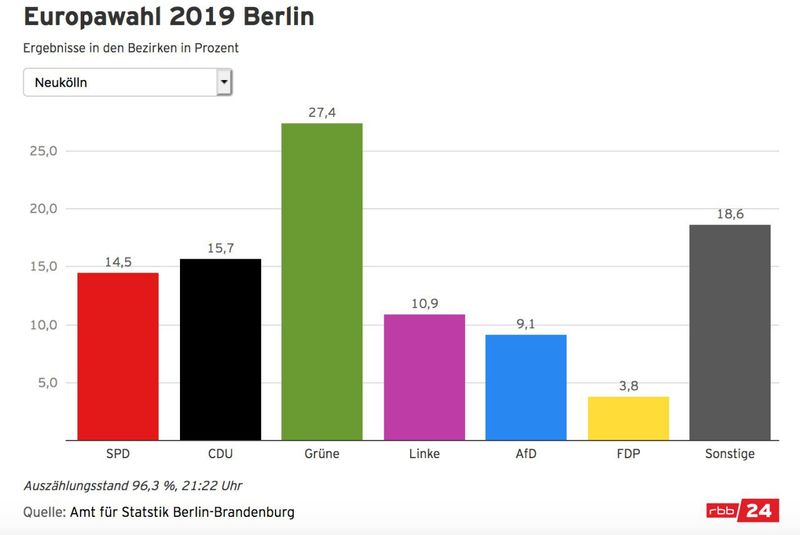 Bei der Europawahl am 26. Mai 2019 holten die Grünen 27,4 % der Stimmen in Neukölln und sind damit mit Abstand die stärkste Kraft vor CDU und SPD.