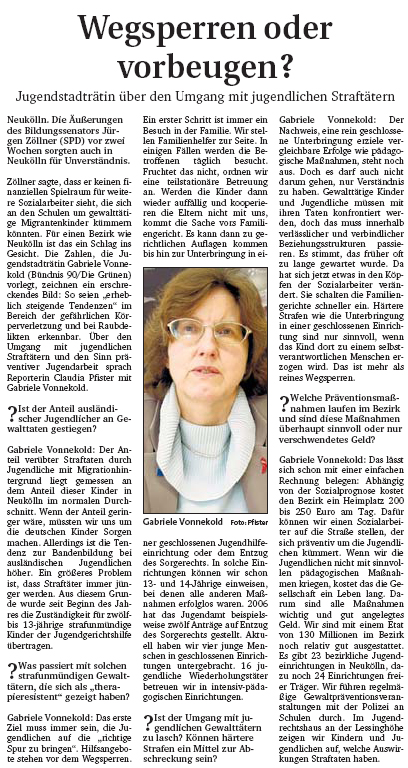 Die Neuköllner Ausgabe der <link http: www.berliner-woche.de _blank external-link-new-window einen externen link in einem neuen>Berliner Woche interviewte für die Ausgabe vom 21. Februar 2007 Gabriele Vonnekold zum Umgang mit jugendlichen Straftätern. Dabei betont unsere Jugendstadträtin, dass es das erste Ziel immer sein muss, "die Jugendlichen auf die "richtige Spur zu bringen." Hilfsangebote stehen vor dem Wegsperren." Dabei kann es jedoch nicht darum gehen, nur Verständnis zu haben: "Gewalttätige Kinder und Jugendliche müssen mit ihren Taten konfrontiert werden, doch das muss immer innerhalb verlässlicher und verbindlicher Beziehungsstrukturen passieren". Dabei muss ein Schwerpunkt auf der Prävention liegen: "Abhängig von der Sozialprognose kostet den Bezirk ein Heimplatz 200 bis 250 Euro am Tag. Dafür können wir einen Sozialarbeiter auf die Straße stellen, der sich präventiv um die Jugendlichen kümmert."