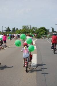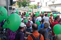 Zwei Stunden später ein völlig anderes Bild. Große und kleine Radfahrer_innen soweit das Auge reicht. Einzelne fahren auf kuriosen, teilweise nicht sehr bequemen, dafür spektakulären selbst gebauten Rädern. Unsere 500 Ballons sind längst verteilt, die ersten Radler_innen sind gestartet. Es herrscht gute Stimmung, obwohl es etwa eine Stunde dauert, bis die letzten Radler_innen ihre Fahrt antreten können. Einer ist schon wieder zurück und berichtet begeistert vom Blitzradeln auf der Autobahn. Ein voller Erfolg. Vielleicht sollten wir das öfter machen.