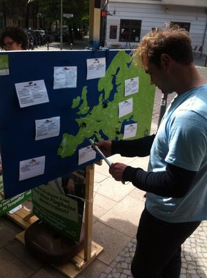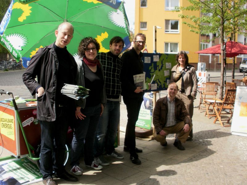 Die Neuköllner Grünen haben am vergangenen Samstag am Maybachufer kreativ für mehr Klimaschutz und eine europaweite Energiewende geworben. Am Maybachufer wurden die Besucher_innen des Marktes von den Aktiven der grünen AG Klimawandel mit Infomaterial versorgt. Neben interessanten Gesprächen bei strahlendem Sonnenschein würde auch spielerisch versucht, die komplexe Energie- und Klimapolitik der Europäischen Union den Menschen näher zu bringen. Hierzu gab es das <link http: de.wikipedia.org wiki external-link-new-window externen link in neuem>Geschicklichkeitsspiel "Der Heiße Draht" als EU-Ausgabe, bei der die Spieler_innen die Drahtöse über eine Europakarte navigieren mussten, ohne den Signalton auszulösen. Das Ganze wurde verbunden mit vielen Hintergrundinformationen zur Klimapolitik in den einzelnen Mitgliedsstaaten.