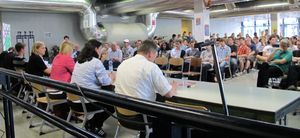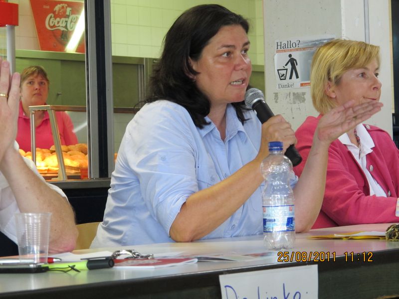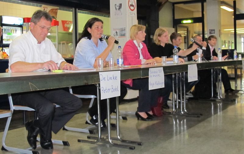 ...hieß es für unsere Abgeordnete Anja Kofbinger am letzten Donnerstag: am 25. August fand von 9:45 Uhr bis 11:15 Uhr im <link http: www.oszimt.de external-link-new-window>OSZ Informations- und Medizintechnik in der Haarlemer Straße in Britz die erste von drei hier angesetzten Podiumsdiskussionen zur Abgeordnetenhaus-Wahl statt. Dabei stellten sich Politiker_innen von verschiedenen zur Wahl antretenden Parteien den Fragen der Schüler_innen. Diesmal ging es um die Themen Schule und Bildung, Integration und Parteien im Allgemeinen, anwesend waren etwa 250 Schüler_innen und Lehrer_innen.