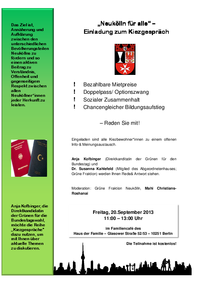 Wir laden herzlich ein zu unserem nächsten Kiezgespräch unter dem Motto "Neukölln für alle" am Freitag, den 20. September 2013 von 11-13 Uhr. Diesmal sind wir zu Gast im Familiencafé des Hauses der Familie. Wir wollen mit Ihnen über die Themen bezahlbare Mietpreise, Doppelpass und Optionszwang,… mehr