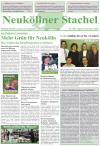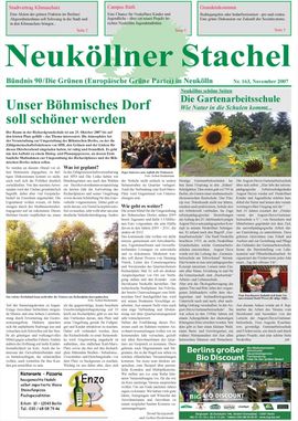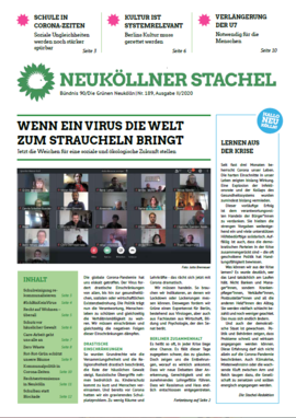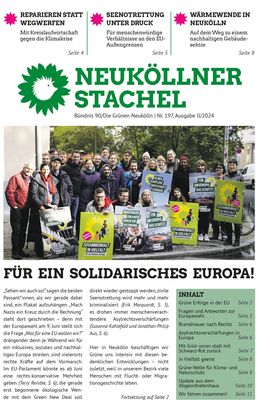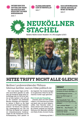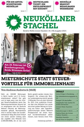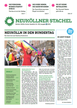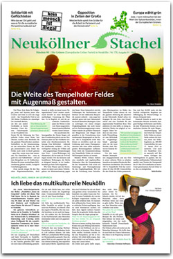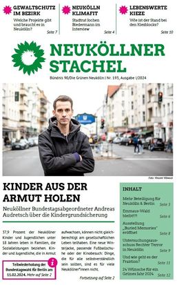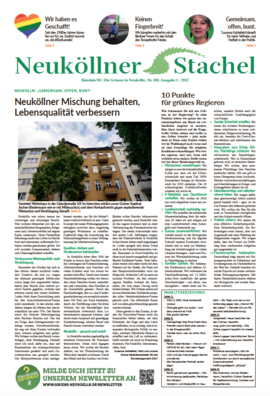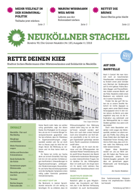 Der Neuköllner Stachel ist die grüne Bezirkszeitung für Neukölln und informiert über aktuelle Themen und Debatten aus grüner Sicht. Die Artikel werden – von Ausgabe zu Ausgabe leicht unterschiedlich – von unseren Aktiven, dem Vorstand, der BVV-Fraktion, von unseren Abgeordneten oder von Gast-Autor*innen geschrieben. Du hast Lust, an der nächsten Ausgabe des nächsten Stachels mitzuarbeiten? Dann melde Dich unter [email protected]!