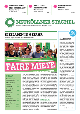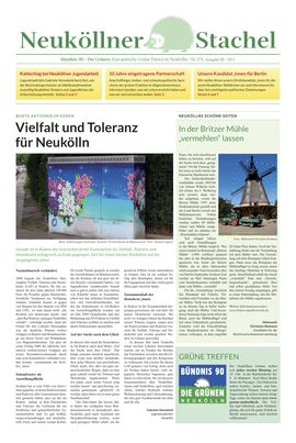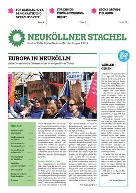 Europawahl: Grüner New Deal für Jobs und Klimaschutz - Neuköllner Städtepartnerschaften - Linkspartei nicht europatauglich - Ethnische Ökonomie - Grüne Randnotizen aus der Neuköllner BVV - Neukölln braucht dringend den verbindlichen Ethik-Unterricht - Interview mit Elisabeth Schrödter und Lisa Paus - Neues Baumsterben - Bürgerbeteiligung hart erarbeiten: über Öffentlichkeit und Transparenz am Richardplatz-Süd - Inn-Sportplatz - Strategien für Neukölln - A100 stoppen - Kazim Ero?an: der gute Mensch von Neukölln