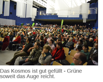 Wir Neuköllner Grüne mussten uns an diesem Morgen zwischen zwei wichtigen Terminen entscheiden: entweder zur Landesmitgliederversammlung (LMV) nach Friedrichshain oder zur Anti-NPD-Kundgebung am Gemeinschaftshaus Gropiusstadt - die Wahl fiel nicht leicht. Doch auch diejenigen, die zunächst in den Neuköllner Süden fuhren, um den Ewiggestrigen klar zu machen, dass in Neukölln kein Platz für ihre menschenverachtende Weltsicht ist, machten sich danach auf den Weg zur LMV. Schon von weitem wurden wir von Grünen Ballons und Fahnen vor dem Kosmos begrüßt.