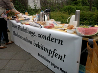 Eine weitere gute Nachricht erfuhren wir Ende April, als die NPD ihre für den 1. Mai geplante Demo in Neukölln absagte! Nach dem fulminanten Reinfall ihrer Demo am Samstag, den 26. April 2014 in "Kreuzberg" (hier fehlten die Ortskenntnisse, denn die Nazis standen in Mitte und kamen da auch erst mal nicht weg), wollten sie sich diese Schmach in Neukölln wenige Tage später nicht noch einmal holen. Geplant war eine Demo durch Neukölln mit dem Ziel, direkt an der Unterkunft für Geflüchtete vorbei zulaufen. Fast alle Gegenkundgebungen und -demos wurden von uns abgesagt, lediglich die Kundgebung nahe der Unterkunft in der Späthstraße wurde aufrechterhalten. Allerdings wurde diese spontan in ein Frühstück unter freiem Himmel umgewandelt. Innerhalb kürzester Zeit gelang die Mobilisierung und viele Menschen beteiligten sich und schleppten Essen und Getränke heran. Mit Anwohner_innen, Unterstützer_innen und Refugees wurde ein toller Vormittag verbracht.