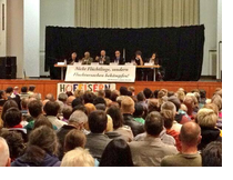 Als Expert_innen hatte die Britzer Initiative "Hufeisern gegen Rechts" Franz Allert vom Landesamtes für Gesundheit und Soziales (LaGeSo), den Grünen Sozialstadtrat Bernd Szczepanski sowie Vertreter_innen vom Flüchtlingsrat Berlin, der Opferberatung ReachOut und des Diakoniewerks Simeon geladen.